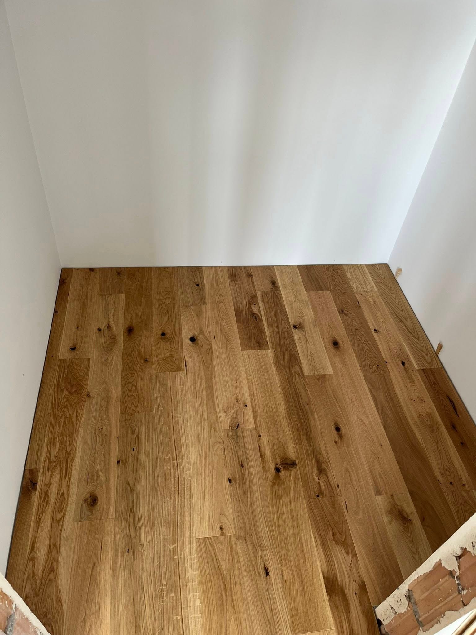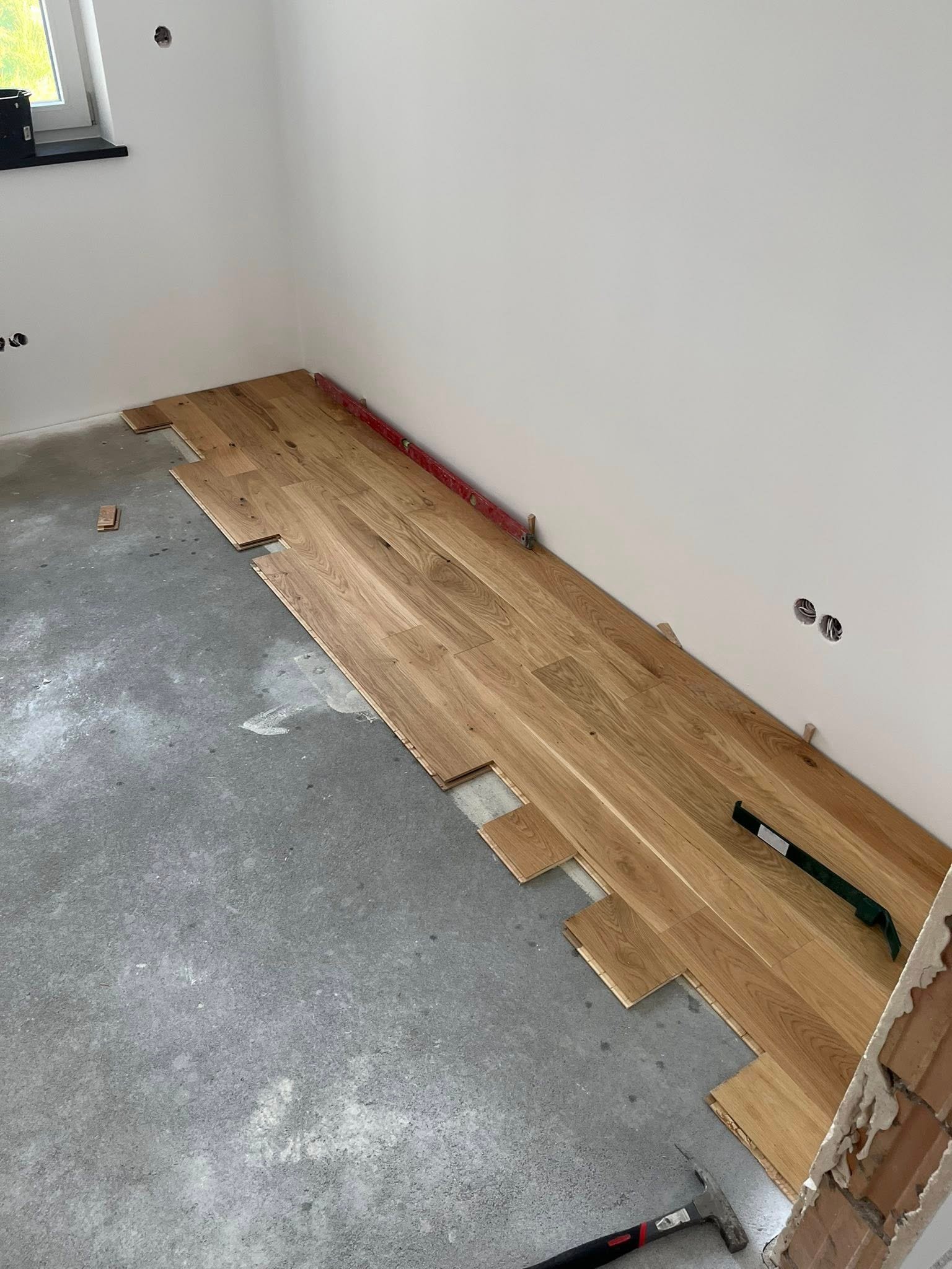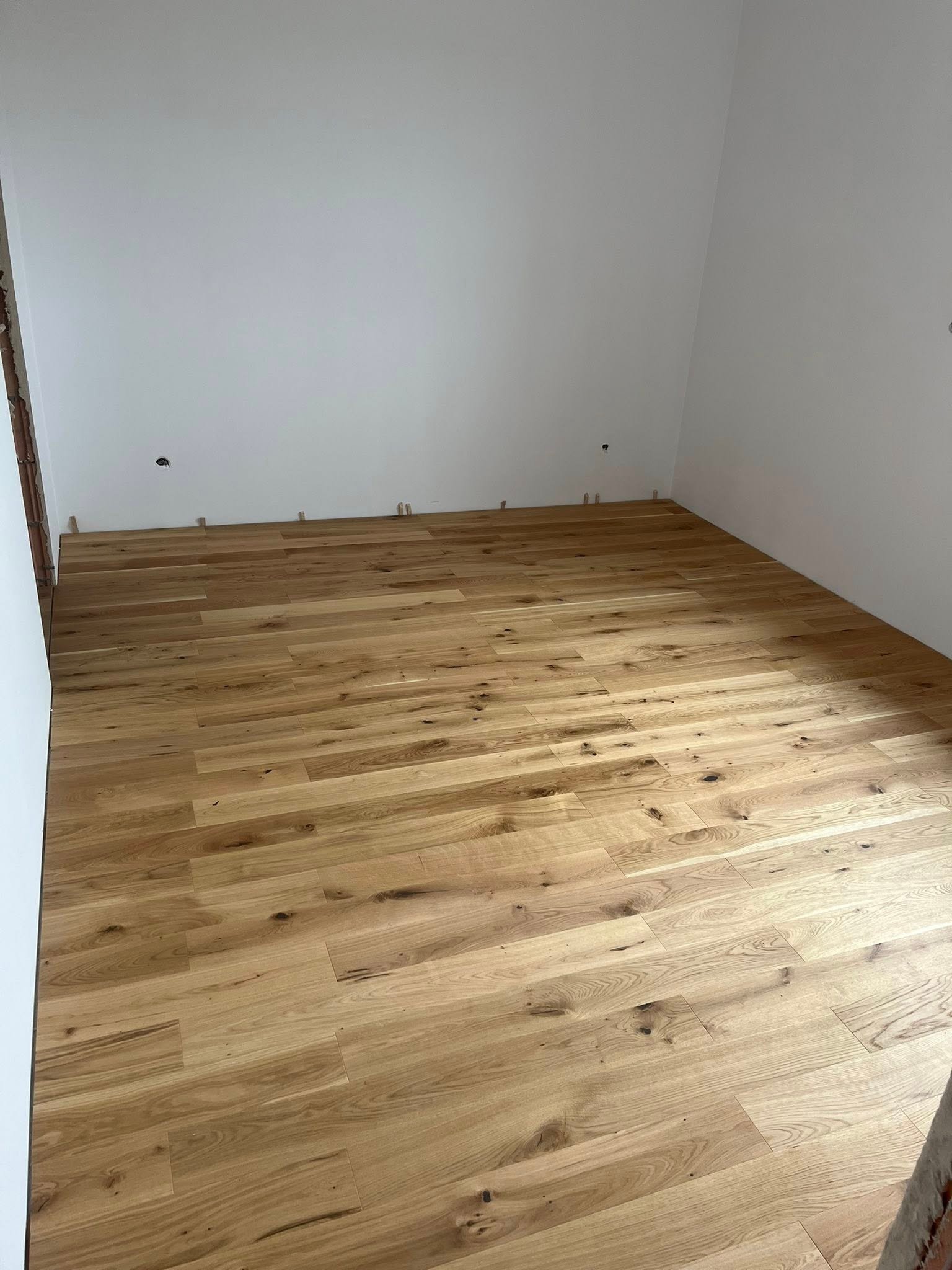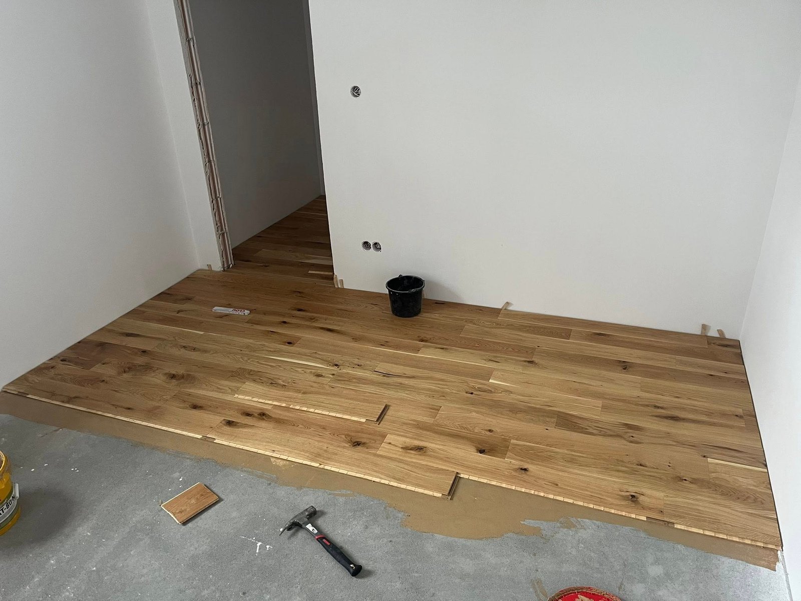 W tej realizacji wykonaliśmy montaż dębowego parkietu trójwarstwowego — rozwiązania, które świetnie sprawdza się przy ogrzewaniu podłogowym dzięki stabilnej konstrukcji. Zadbaliśmy o prawidłowe przygotowanie podłoża oraz precyzyjne ułożenie desek, tak aby zachować równą linię, estetyczne mijanki i czyste wykończenie przy ścianach.