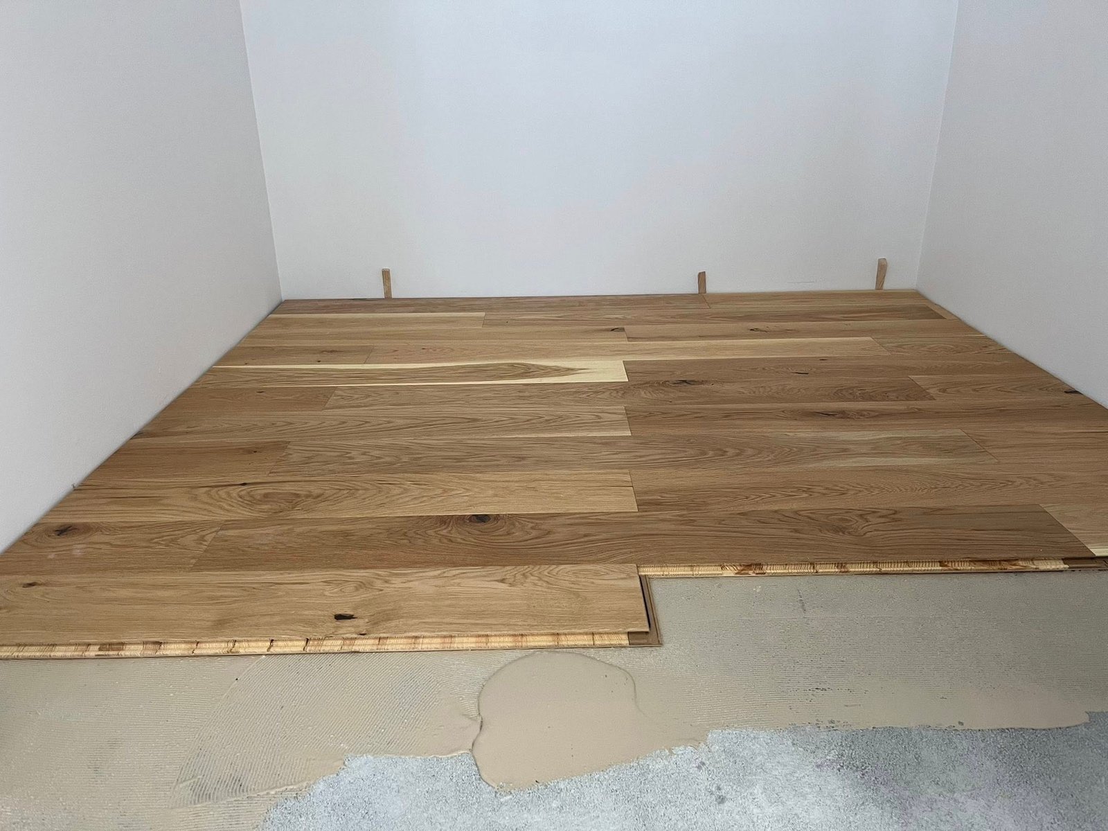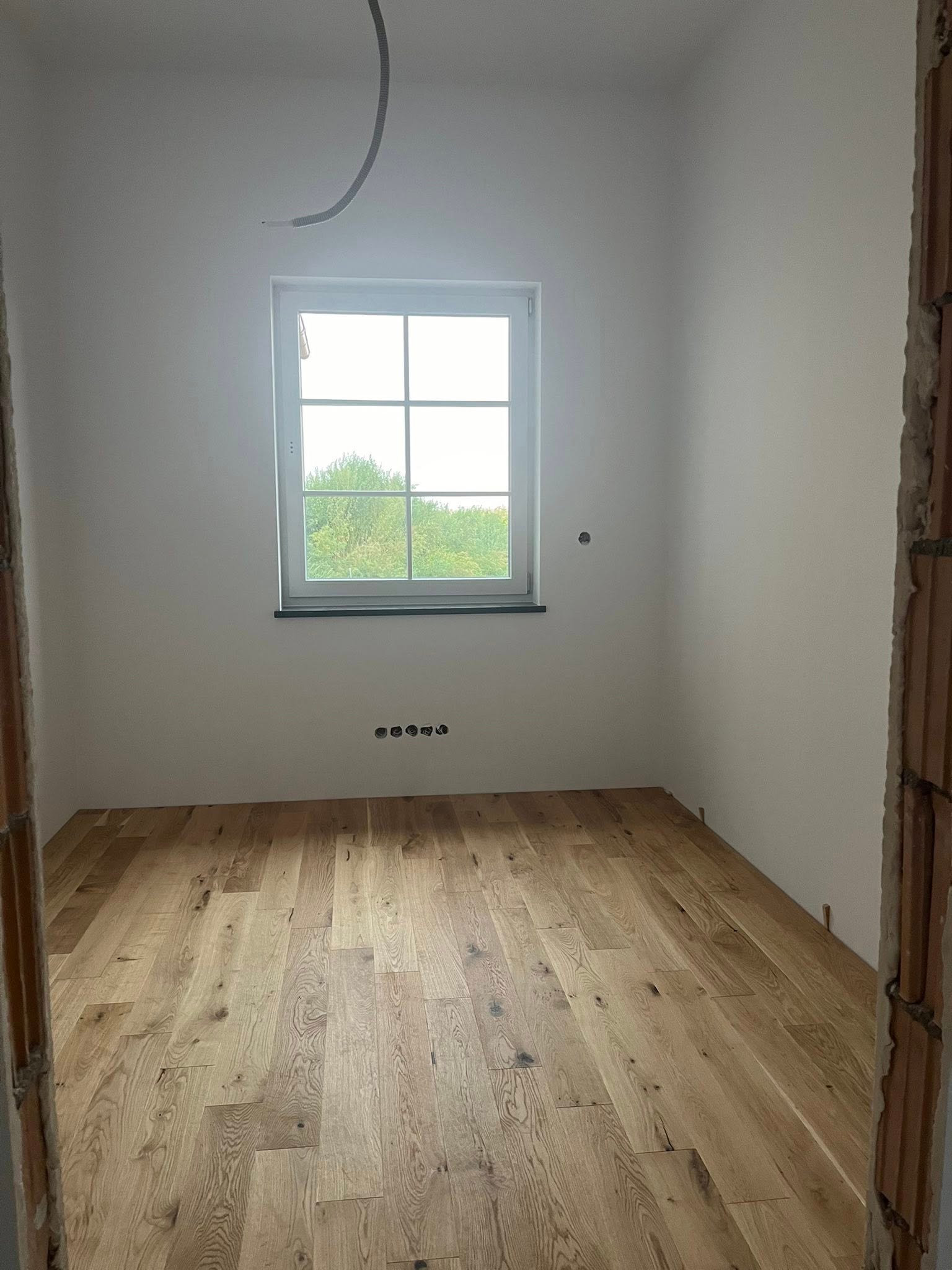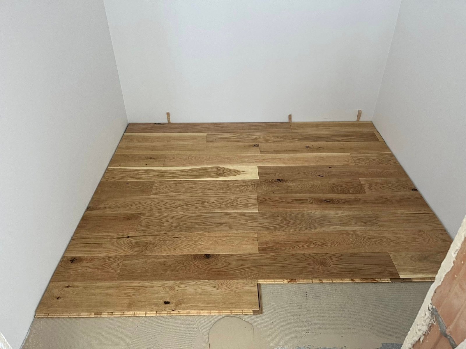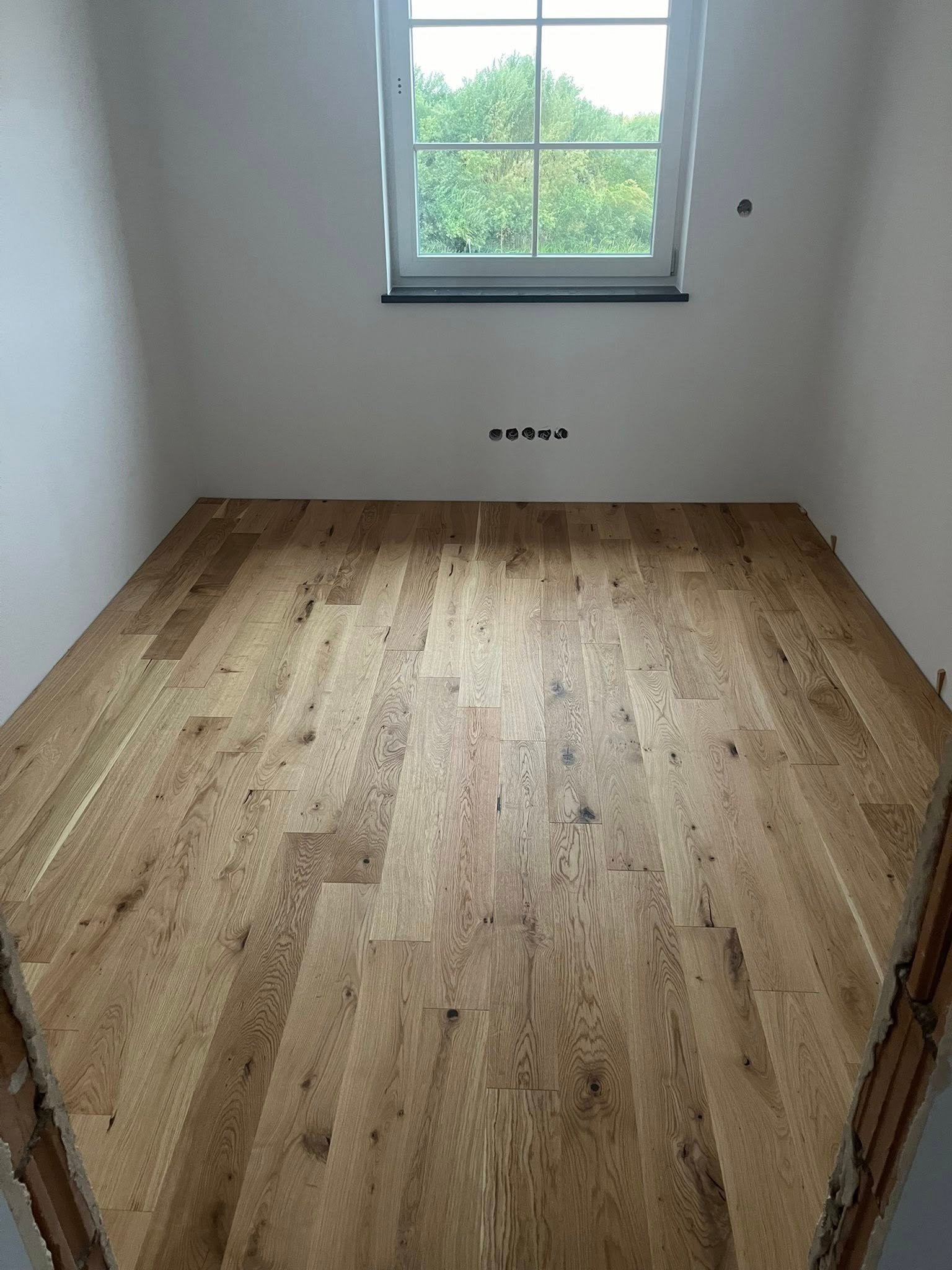 W tej realizacji wykonaliśmy montaż dębowego parkietu trójwarstwowego — rozwiązania, które świetnie sprawdza się przy ogrzewaniu podłogowym dzięki stabilnej konstrukcji. Zadbaliśmy o prawidłowe przygotowanie podłoża oraz precyzyjne ułożenie desek, tak aby zachować równą linię, estetyczne mijanki i czyste wykończenie przy ścianach.